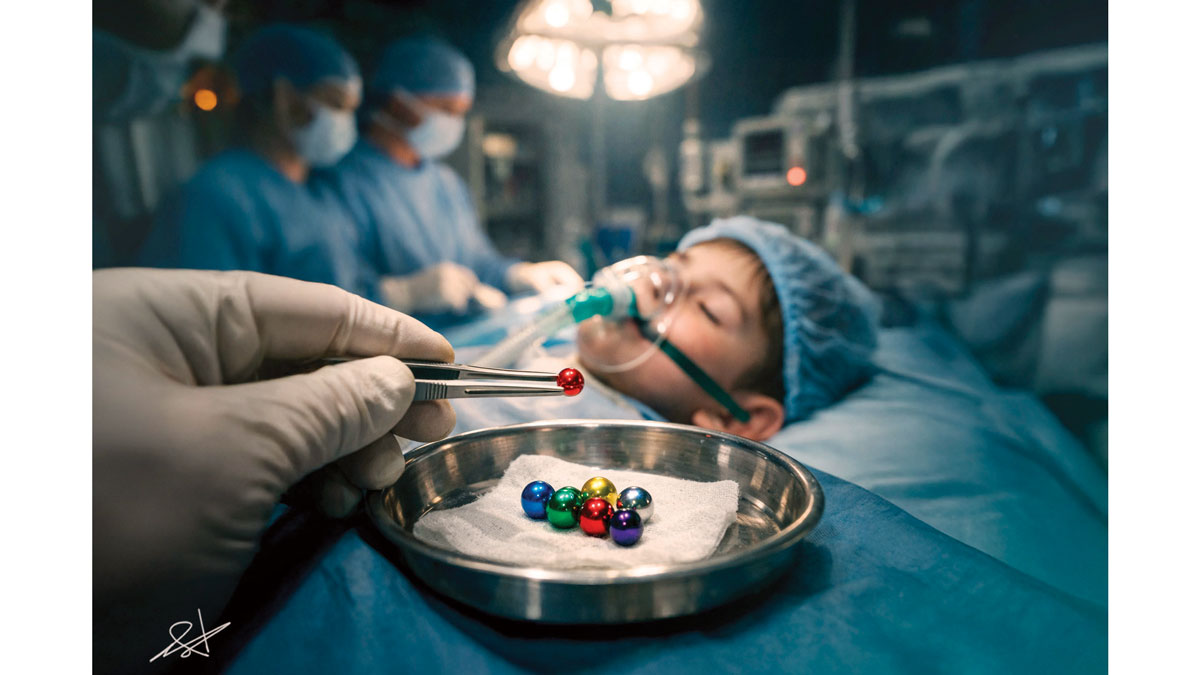 وأوضح أن الخطورة الحقيقية تكمن في قوة الجذب المغناطيسي العالية، إذ إن ابتلاع أكثر من كرة قد يؤدي إلى التصاقها ببعضها داخل الجهاز الهضمي، كأن تكون إحداها في المعدة والأخرى في الأمعاء، ما يسبب انسدادات حادة والتصاقات معوية خطيرة، مبيناً أن هذه الحالات غالباً لا يمكن علاجها باستخدام المناظير، بل تتطلب تدخلاً جراحياً عاجلاً، وقد تتطور المضاعفات إلى ثقوب في الأمعاء أو غرغرينا، تستدعي إدخال الطفل إلى العناية المركزة، وقد تصل في بعض الحالات إلى الوفاة.