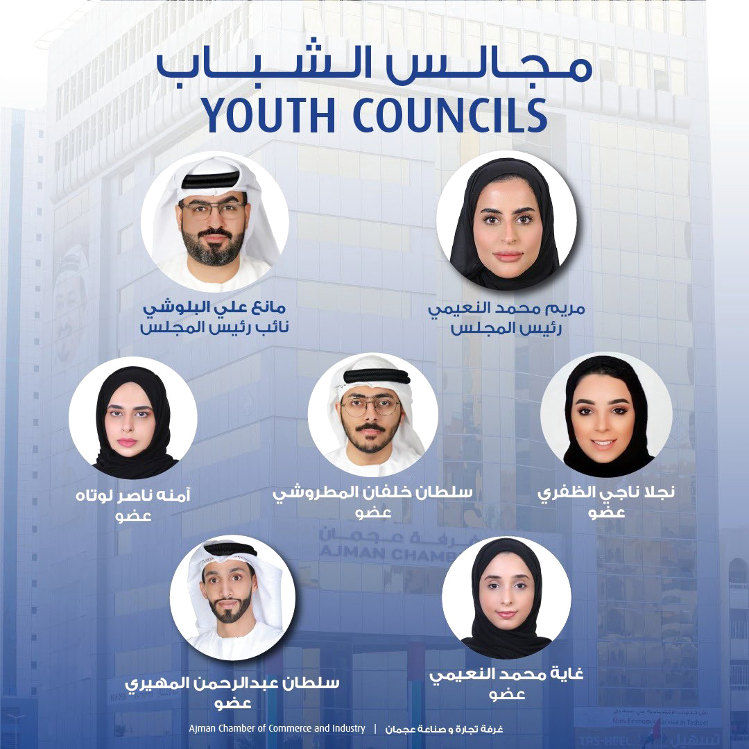ضم مجلس شباب الغرفة، مريم محمد سعيد النعيمي رئيساً، ومانع علي البلوشي نائب الرئيس، وعضوية كل من نجلا ناجي الظفري، سلطان خلفان المطروشي، آمنه ناصر لوتاه، غاية محمد النعيمي، وسلطان عبدالرحمن المهيري.