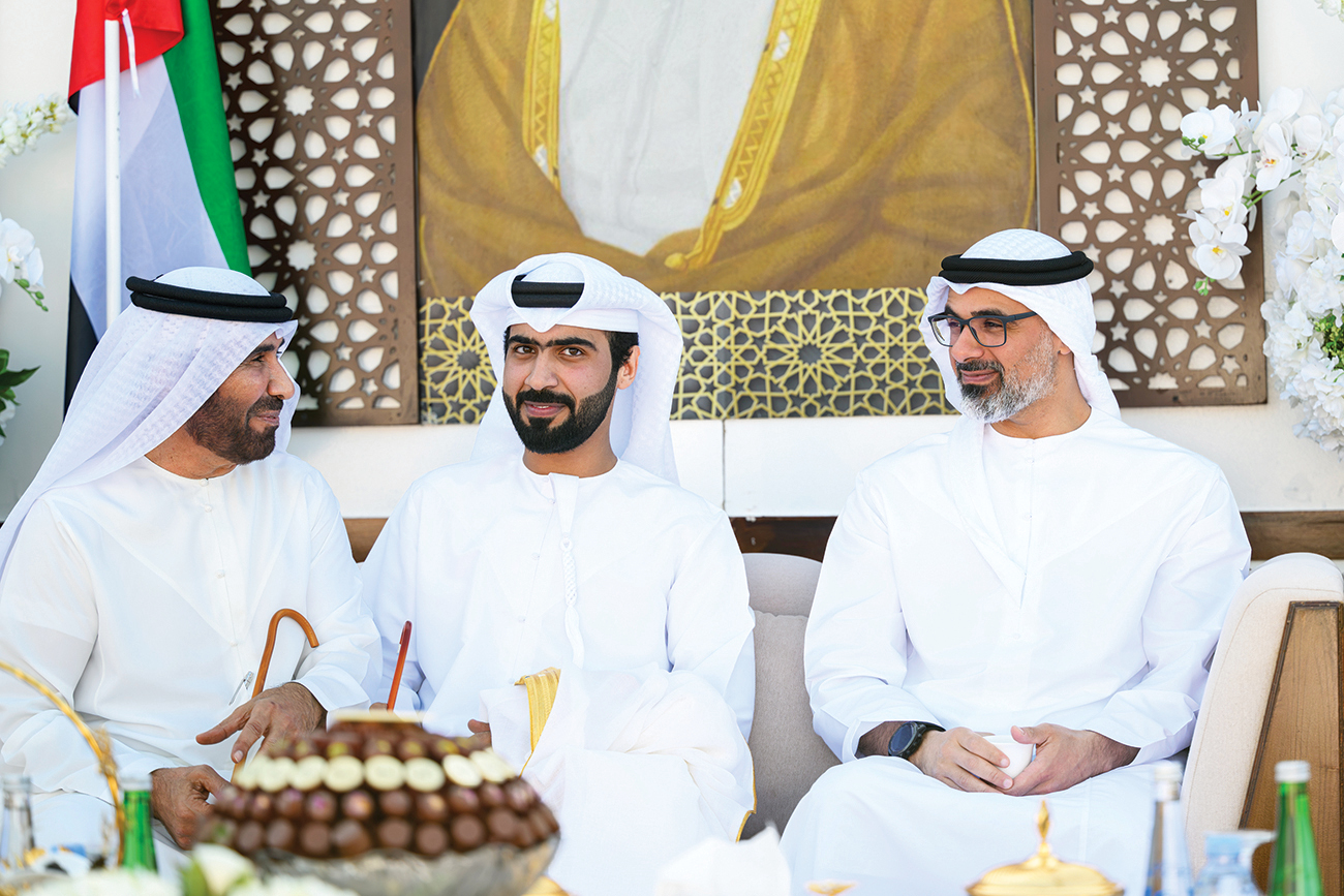 حضر سمو الشيخ خالد بن محمد بن زايد آل نهيان، ولي عهد أبوظبي، حفل استقبال أقامه جمعة مانع الغويص السويدي بمناسبة زفاف نجله حمد على كريمة سلطان راشد خليفة الشامسي.