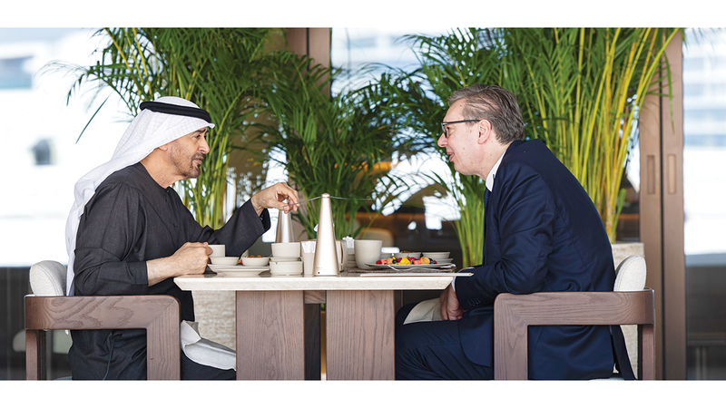 بحث صاحب السمو الشيخ محمد بن زايد آل نهيان، رئيس الدولة، حفظه الله، ورئيس جمهورية صربيا، الكسندر فوتشيتش، أمس، مختلف جوانب التعاون والعمل المشترك بين البلدين وفرص تنميتهما، خصوصاً في المجالات الاقتصادية والاستثمارية والتنموية والطاقة المتجددة والاستدامة، وغيرها من القطاعات الحيوية التي تعزز التنمية والازدهار في البلدين، وذلك في إطار الشراكة الإستراتيجية الشاملة التي تجمع دولة الإمارات وصربيا.
