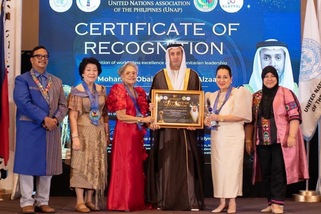 تم تكريم محمد عبيد الزعابي سفير دولة الإمارات لدى جمهورية الفلبين، ومنحه لقب “سفير النوايا الحسنة للسلام”، من قبل جمعية الأمم المتحدة في الفلبين (UNAP)، خلال الاحتفال بالذكرى الثمانين لتأسيس منظمة الأمم المتحدة، وحفل جوائز العمل الإنساني المتميز الذي أقيم بتاريخ 24 أكتوبر 2025.