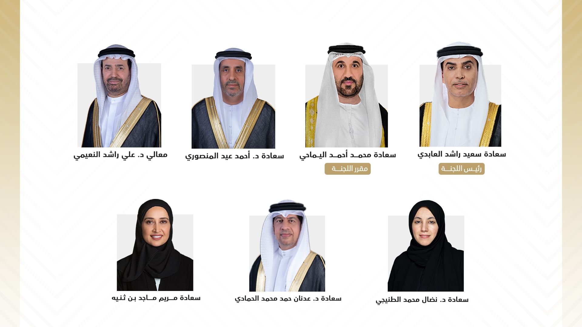 وتضم اللجنة في عضويتها رؤساء اللجان الدائمة للمجلس كل من سعادة الدكتور أحمد عيد المنصوري، ومعالي الدكتور علي راشد النعيمي، وسعادة الدكتورة نضال محمد الطنيجي، وسعادة الدكتور عدنان حمد الحمادي، وسعادة مريم ماجد بن ثنية.
