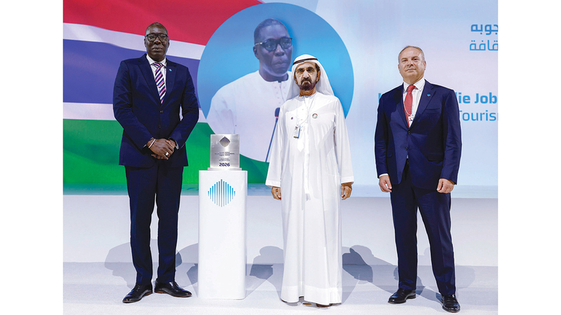 كرّم صاحب السمو الشيخ محمد بن راشد آل مكتوم، نائب رئيس الدولة رئيس مجلس الوزراء حاكم دبي، رعاه الله، بحضور سمو الشيخ حمدان بن محمد بن راشد آل مكتوم، ولي عهد دبي نائب رئيس مجلس الوزراء وزير الدفاع رئيس المجلس التنفيذي لإمارة دبي، وسمو الشيخ عمار بن حميد النعيمي، ولي عهد عجمان، وسمو الشيخ محمد بن حمد بن محمد الشرقي، ولي عهد الفجيرة، أمس، وزير السياحة والثقافة في جمهورية غامبيا، عبدولي جوبة، بجائزة أفضل وزير في العالم في دورتها التاسعة، وذلك ضمن أعمال القمة العالمية للحكومات 2026.