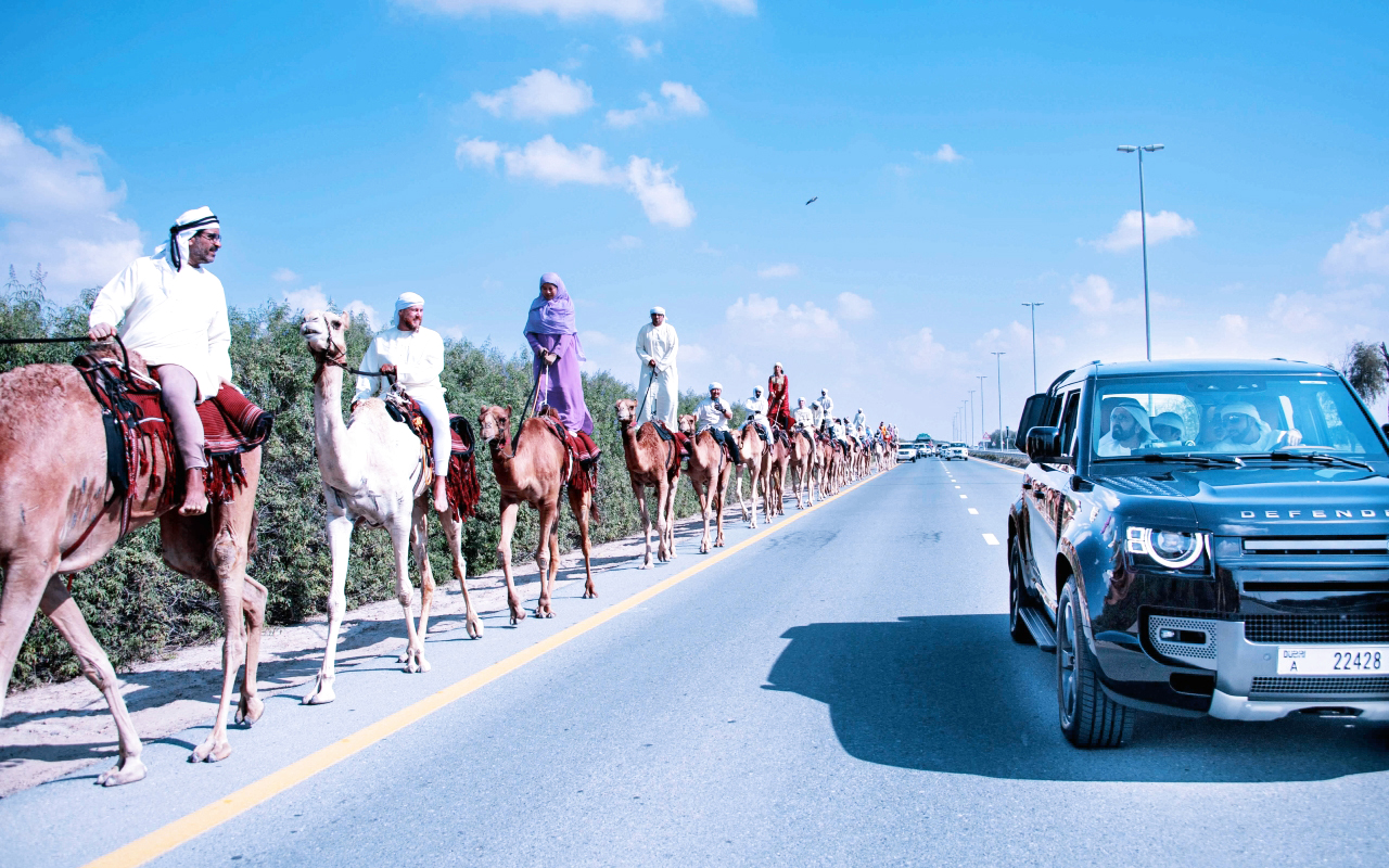 التقى صاحب السمو الشيخ محمد بن راشد آل مكتوم نائب رئيس الدولة رئيس مجلس الوزراء حاكم دبي، رعاه الله، المشاركين في «رحلة الهجن» التي تنظمها إدارة الفعاليات في مركز حمدان بن محمد لإحياء التراث، وذلك في منطقة سيح السلم بمحمية المرموم بدبي، خلال توجههم في طريقهم نحو القرية التراثية في القرية العالمية، بعدما قطعوا الصحراء الإماراتية لنحو 12 يوماً بصورة متواصلة، من منطقة عرادة في أبوظبي وصولاً إلى دبي.