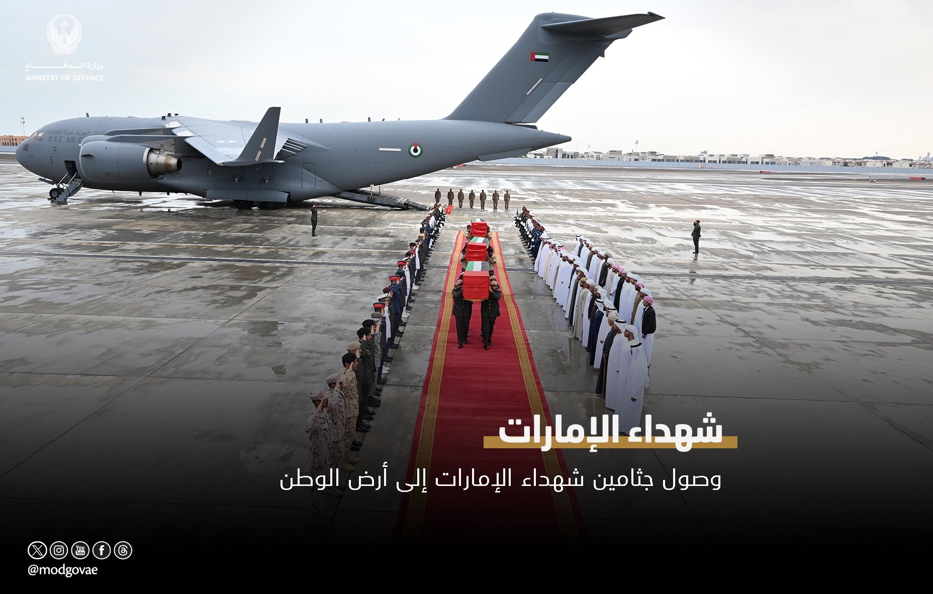 وصلت إلى مطار البطين الخاص بأبوظبي صباح اليوم جثامين شهداء الوطن الأبرار الأربعة .. العقيد محمد المنصوري والوكيل/ 1 محمد الشامسي والوكيل/ 1 خليفة البلوشي والعريف سليمان الشحي، وذلك على متن طائرة عسكرية تابعة للقوات المسلحة.