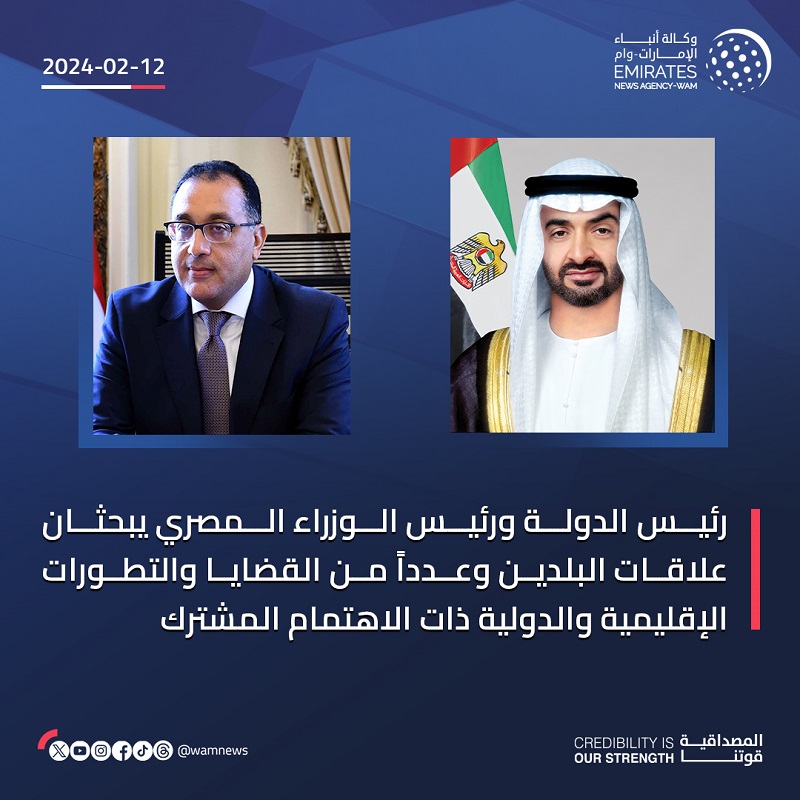 بحث صاحب السمو الشيخ محمد بن زايد آل نهيان رئيس الدولة “حفظه الله” ودولة الدكتور مصطفى مدبولي رئيس وزراء جمهورية مصر العربية الشقيقة..العلاقات الأخوية الراسخة وجوانب التعاون والعمل المشترك بين البلدين وسبل تنميتها في مختلف المجالات بما يحقق مصالحهما المتبادلة انطلاقا من الشراكة الإستراتيجية التي تجمعهما..إضافة إلى عدد من القضايا والتطورات الإقليمية والدولية ذات الاهتمام المشترك.