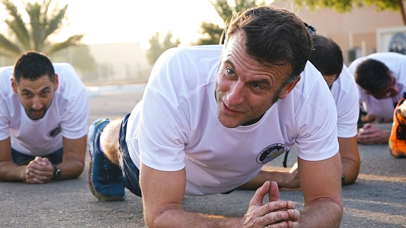 ويبدو ماكرون في الفيديو مرتدياً «شورت» أزرق وقميصاً أبيض، وهو يوجه الجنود لأداء مجموعة من تمارين الضغط، إضافة إلى تمارين «البلانك» ورفع الركبة، وذلك أمام مركبة مدرعة، قبل أن ينطلق معهم في الجري، وجاء هذا المشهد ليعزز الصورة التي أراد الرئيس إبرازها، وهي صورة القائد القريب من جنوده والمتشارك معهم في الجهد البدني.