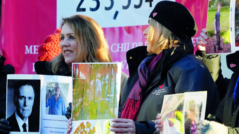نشطاء وعائلات الذين ماتوا أثناء وباء «كورونا» يحملون لافتات أثناء انتظار وصول رئيس الوزراء البريطاني، ريشي سوناك، للتحقيق في وباء كورونا في لندن. وكان سوناك وزيراً للخزانة خلال فترة الوباء، ومن المرجح أن يتم استجوابه حول تأثير سياساته على انتشار المرض. وذكرت صحف محلية قبل أشهر أن وزراء في عهد بوريس جونسون خاضوا معركة للحفاظ على سرية عدد كبير من الرسائل الحساسة بين جونسون ووزرائه، بمن فيهم رئيس الوزراء الحالي، تطالب جهات التحقيق بتسليمها دون تنقيح.