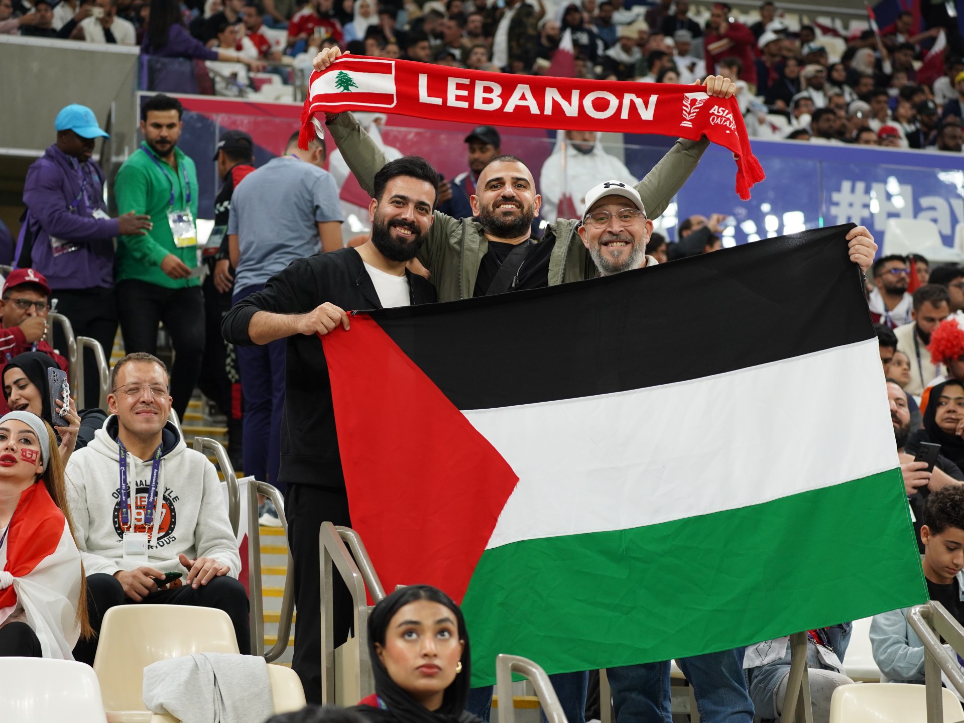 على ملعب لوسيل الذي يتسع لـ88 ألف متفرّج، وقبل انطلاق المباراة الافتتاحية للدولة المضيفة مع لبنان، قدّم قائد قطر حسن الهيدوس نظيره الفلسطيني مصعب البطاط الذي أدى قسم البطولة. وجاء ذلك بعد عرض غنائي وراقص تم فيه استخدام جزء من النشيد الوطني الفلسطيني.