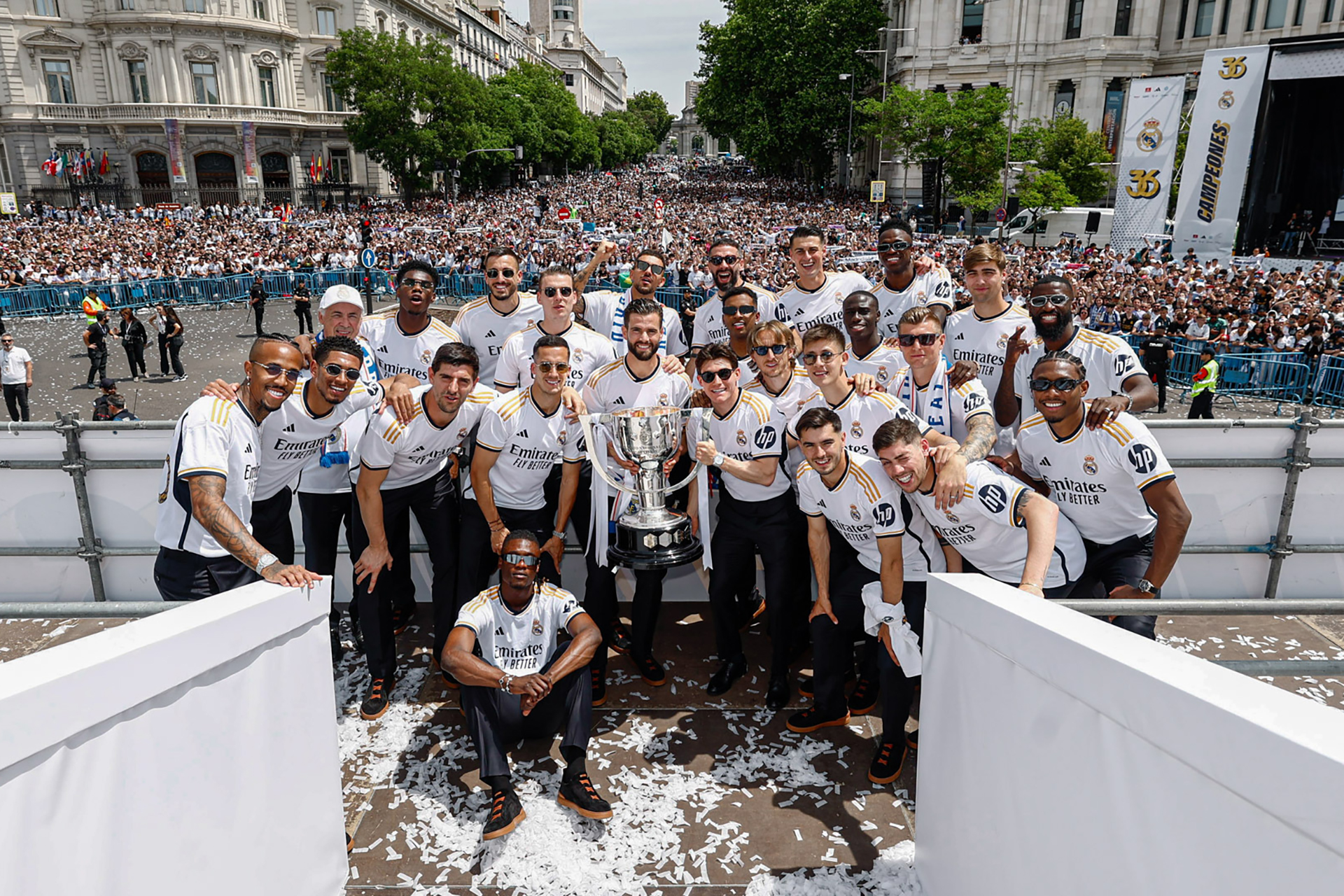 احتفل لاعبو ريال مدريد وجهازه الفني باللقب الـ36 في الدوري الإسباني لكرة القدم، اليوم الأحد، مع آلاف عدة من أنصاره وهم يتطلعون من الآن إلى المباراة النهائية لدوري أبطال أوروبا ضد بوروسيا دورتموند الألماني، وإمكانية انضمام النجم الفرنسي كيليان مبابي إلى صفوفهم.