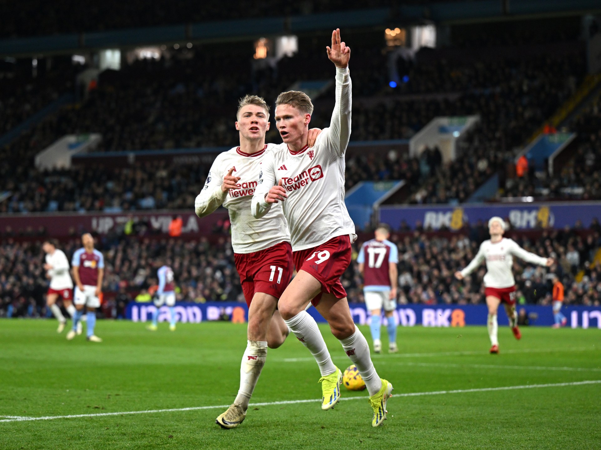 وأدرك البرازيلي دوغلاس لويز التعادل لأستون فيلا في الدقيقة 67، لكن سرعان ما أعاد (البديل) الأسكتلندي سكوت مكتوميناي مانشستر يونايتد للمقدمة من جديد، بتسجيله الهدف الثاني للفريق الملقب بـ(الشياطين الحمر) في الدقيقة 86، ليمنح النقاط الثلاث لناديه في الوقت القاتل.