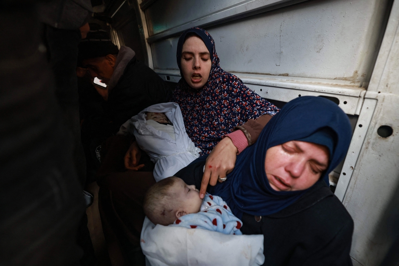 تنتحب رانيا أبو عنزة وهي تحمل طفليها الرضيعين المكفنين متسائلة: «من سيقول لي ماما؟»، بعدما لقيا حتفهما في غارة جوية أمس، إلى جانب 14 من أقاربها.