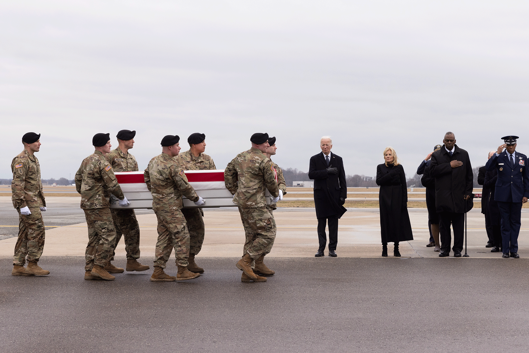 حضر الرئيس جو بايدن، الجمعة، مراسم وصول رفات ثلاثة جنود أمريكيين قتلوا في هجوم بطائرة مسيرة في الأردن إلى الولايات المتحدة.